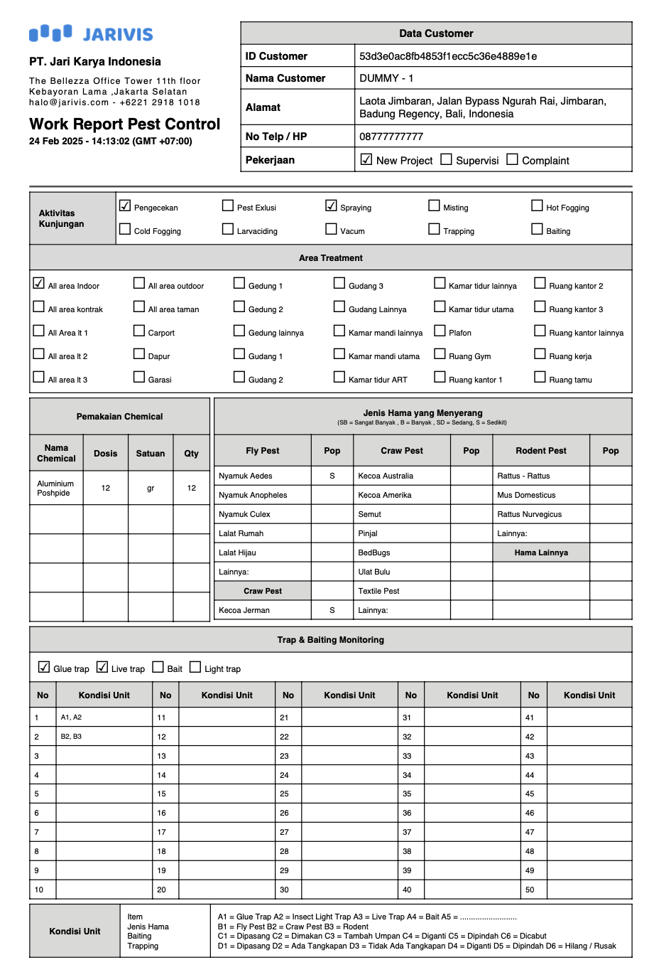 Standard laporan Jarivis sudah dapat mencakup keseluruhan kebutuhan Perusahaan Pest Control Anda, namun apabila Anda memiliki standard pelaporan sendiri, kami bisa buatkan untuk Anda.